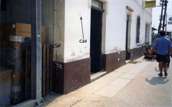 | Contrassegni | [{"simbolo_contrassegno":"P3","materializzazione":"(CSO) ( A ; NON MISURABILE ) Alla base del muro laterale sinistro spigolo destro."},{"simbolo_contrassegno":"V2","materializzazione":"(CSV) Sulla facciata anteriore in prossimit\u00e0 dello spigolo sinistro."}] |