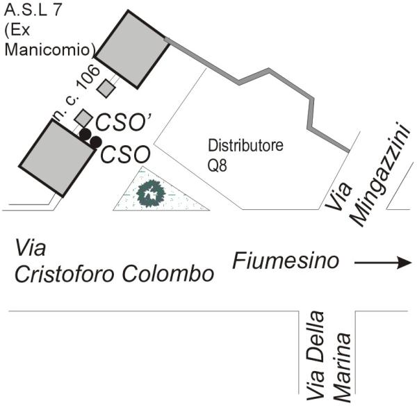 [{"simbolo_contrassegno":"P5","materializzazione":"(CSO) Pozzetto posto a terra, ai piedi del marciapiede, nell'angolo formato dal muro di recinzione dell'ingresso e dall'edificio della portineria."},{"simbolo_contrassegno":"B1","materializzazione":"(CSO') Bullone d'altro ente infisso sul muro a sinistra dell'ingresso della portineria dell'A.S.L. 7 (Ex Manicomio)."}]