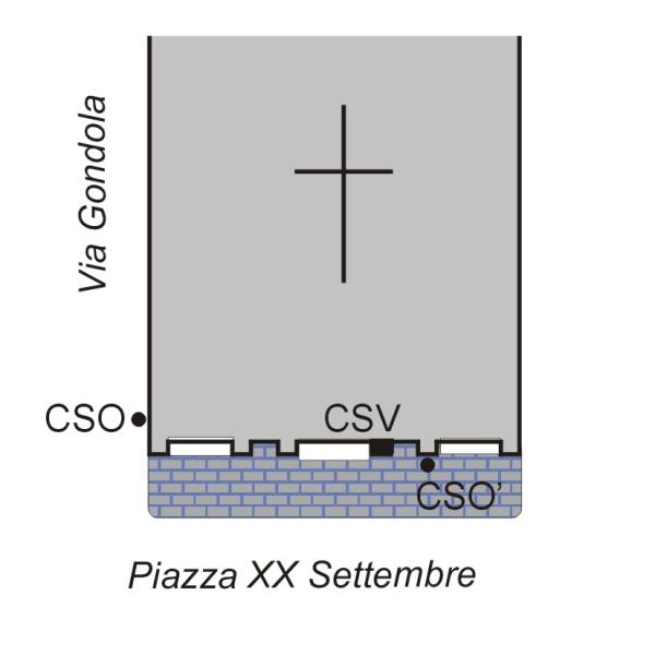 | Contrassegni | [{"simbolo_contrassegno":"P3","materializzazione":"(CSO) ( A ; NON MISURABILE ) Pozzetto posto a terra fra i due pilastri a destra della porta centrale."},{"simbolo_contrassegno":"V1","materializzazione":"(CSV) Mensola IGM infissa sul pilastro destro della facciata della chiesa, vicino alla porta principale."},{"simbolo_contrassegno":"B1","materializzazione":"(CSO') Bullone infisso sulla parete laterale sinistra della chiesa, nei pressi dello spigolo destro."}] |