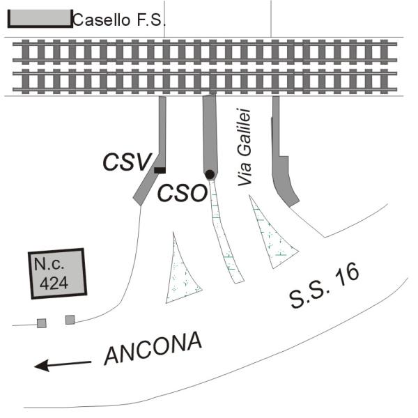 | Contrassegni | [{"simbolo_contrassegno":"B1","materializzazione":"(CSO) Bullone infisso sulla pila centrale del sottovia ferroviario"},{"simbolo_contrassegno":"V1","materializzazione":"(CSV) Mensola IGM infissa sul pilone di sinistra del sottovia ferroviario."}] |