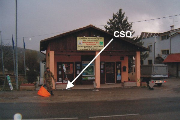 [{"simbolo_contrassegno":"P3","materializzazione":"(CSO) – Pozzetto sito a sinistra della S.S.17 nell'area antistante un piccolo negozio (Prodotti Tipici) posto immediatamente prima del bivio per Barisciano procedendo verso l'Aquila."},{"simbolo_contrassegno":"B4","materializzazione":"(CSO') – centrino universale posto sul penultimo gradino del basamento della croce, spigolo sud, ubicato alle spalle del negozio."}]