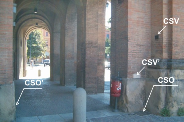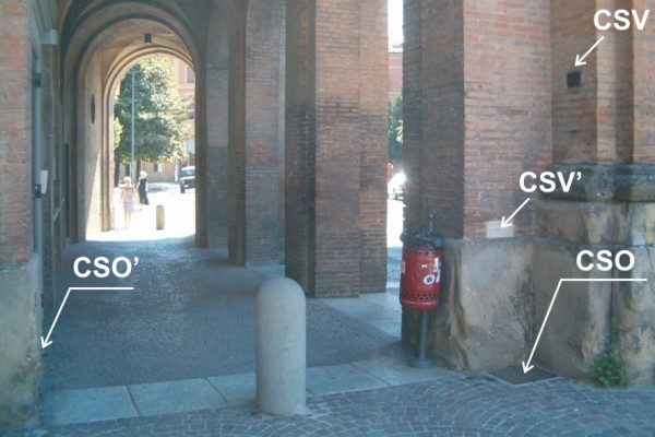 | Contrassegni | [{"simbolo_contrassegno":"P4","materializzazione":"(CSO) Pozzetto di IV Categoria rialzato con tubo in PVC e protetto con tappo in ghisa ,ubicato sotto un coperchio in ghisa anonimo di dimensioni 0,38 x 0,38 m posto alla base della facciata esterna della porta, nell'angolo a destra del passaggio pedonale di sinistra."},{"simbolo_contrassegno":"B1","materializzazione":"(CSO') Bullone della Rete Regionale di Controllo della Subsidenza n\u00b0 025240, infisso internamente nella colonna sinistra della porta pedonale sinistra di accesso alla citt\u00e0."},{"simbolo_contrassegno":"V3","materializzazione":"(CSV) Piastrina antica infissa sulla stessa facciata a destra del CSO."},{"simbolo_contrassegno":"V5","materializzazione":"(CSV') Targa con linea incisa di marmo infissa sopra il CSO."}] |