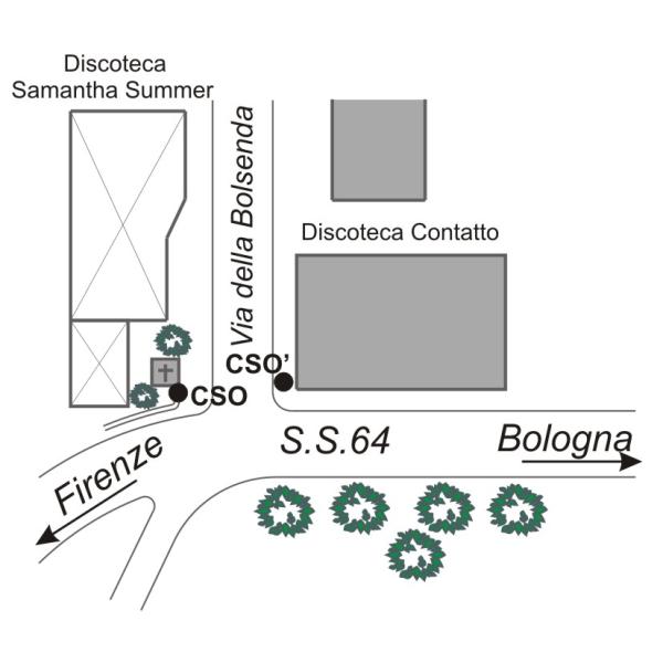 [{"simbolo_contrassegno":"B4","materializzazione":"(CSO) Centrino universale orizzontale cementato alla sinistra del tabernacolo della Madonna di Boccadirlo, tra questo e il muretto."},{"simbolo_contrassegno":"B2","materializzazione":"(CSO') Chiodo anonimo di altro Ente cementato sul marciapiede della casa, presso lo spigolo destro lato Via della Bolsenda."}]