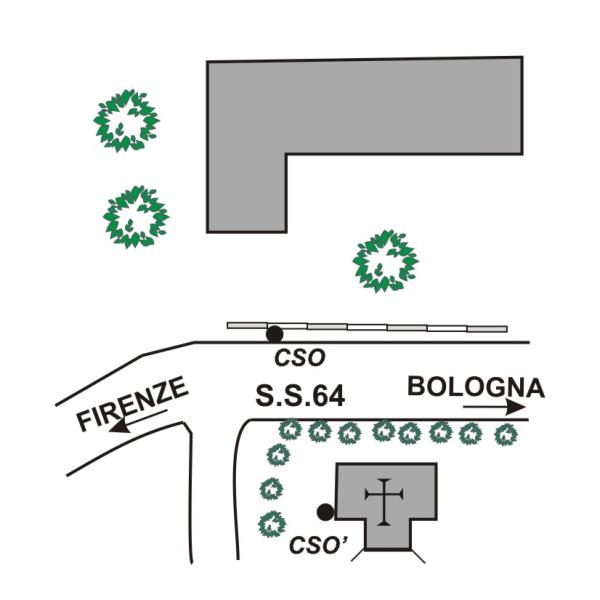 [{"simbolo_contrassegno":"B1","materializzazione":"(CSO) Bullone infisso nel muro di cinta a monte della strada, in corrispondenza dello spigolo della chiesa situata a destra, direzione Bologna, della S.S. 64."},{"simbolo_contrassegno":"B1","materializzazione":"(CSO') Bullone della Rete Regionale di Controllo della Subsidenza n\u00b0 025070, infisso nella parete laterale destra della cappella, spigolo destro."}]