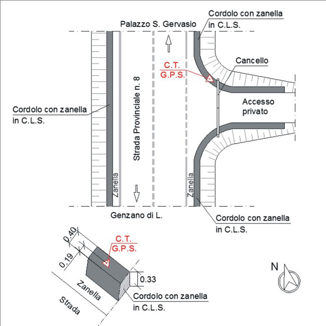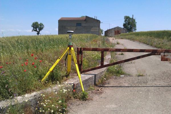 | materializzazione | Centrino metallico orizzontale di tipo chiodo con rondella ARPAB Regione Basilicata infisso sul cordolo stradale in cemento . |