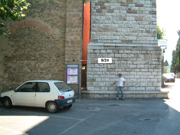 [{"simbolo_contrassegno":"B2","materializzazione":"(CSO) Chiodo anonimo infisso sul gradino in pietra della base del campanile, lato piazza, a 0.25 m dallo spigolo sinistro della base suddetta"},{"simbolo_contrassegno":"V2","materializzazione":"(CSV) Piastrina a barilotto infissa sulla l\u00e8sena all'estremit\u00e0 destra della facciata della chiesa"}]