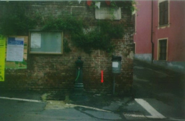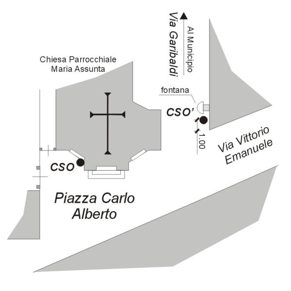 | Contrassegni | [{"simbolo_contrassegno":"P5","materializzazione":"(CSO) Pozzetto con tubo e tappo in ghisa posto alla base della facciata, nell'angolo a destra dell' ingresso laterale di sinistra"},{"simbolo_contrassegno":"B1","materializzazione":"(CSO')-Bullone in ghisa infisso nel muro di cinta in mattoni, angolo piazza Carlo Alberto e via Vittorio Emanuele, in basso sulla destra della fontana"}] |