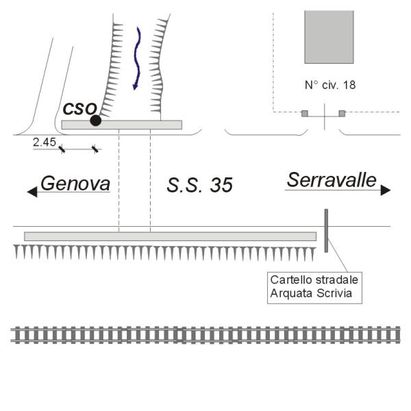 | Contrassegni | [{"simbolo_contrassegno":"B1","materializzazione":"(CSO) Bullone in ghisa infisso presso lo spigolo sinistro del parapetto in mattoni, lato sinistro S.S.35 in direzione Serravalle."}] |