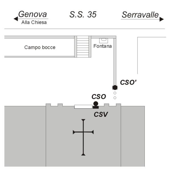 | Contrassegni | [{"simbolo_contrassegno":"P3","materializzazione":"(CSO) Pozzetto in ghisa posto alla base della facciata a sinistra della porta d'ingresso"},{"simbolo_contrassegno":"V3","materializzazione":"(CSV)-Piastrina in ghisa del L.P.infissa sulla facciata a sinistra della porta d'ingresso, in corrispondenza del CSO"},{"simbolo_contrassegno":"B4","materializzazione":"(CSO')-Chiodo GPS infisso al centro del plinto in pietra alla fine del muro in mattoni che delimita la piazzetta perpendicolare alla S.S. 35, di fronte alla chiesa"}] |