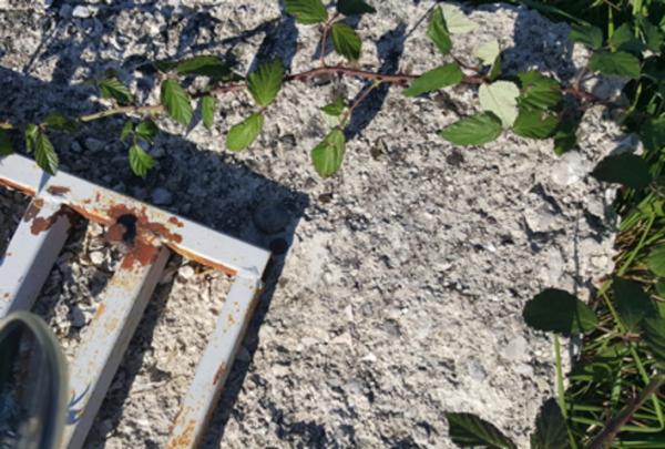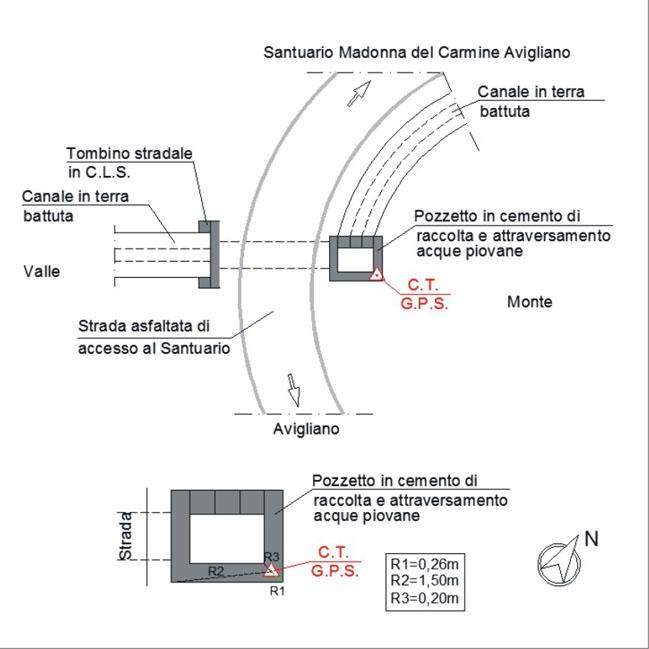| materializzazione | Asse del gambo del centrino metallico orizzontale infisso sul pozzetto in cemento di attraversamento strada per la raccolta delle acque piovane. |