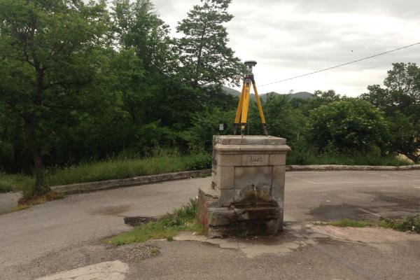 | materializzazione | Centrino metallico orizzontale di tipo chiodo con rondella ARPAB Regione Basilicata infisso sulla testa della Fontana in pietra denominata "Fontana di Minuzzaro". |