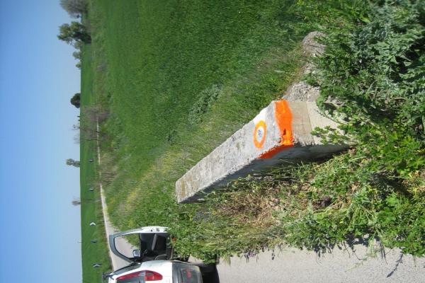 Centrino metallico orizzontale di tipo chiodo con rondella ARPAB Regione Basilicata infisso sulla testa del muro in calcestruzzo tombino stradale.