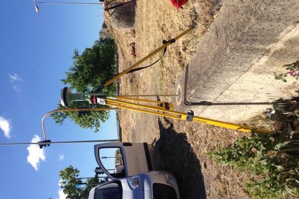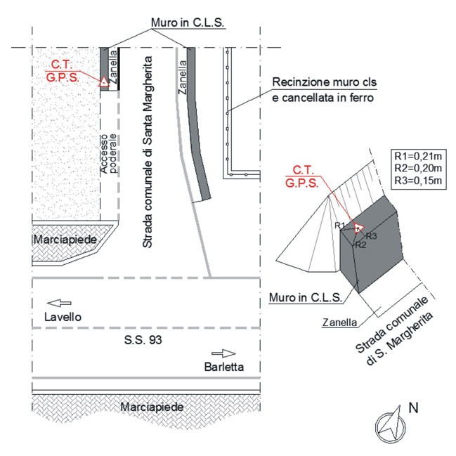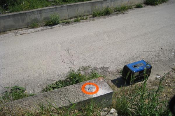 | materializzazione | Centrino metallico orizzontale di tipo chiodo con rondella ARPAB Regione Basilicata infisso sulla testa del muro in calcestruzzo di contenimento scarpata. |