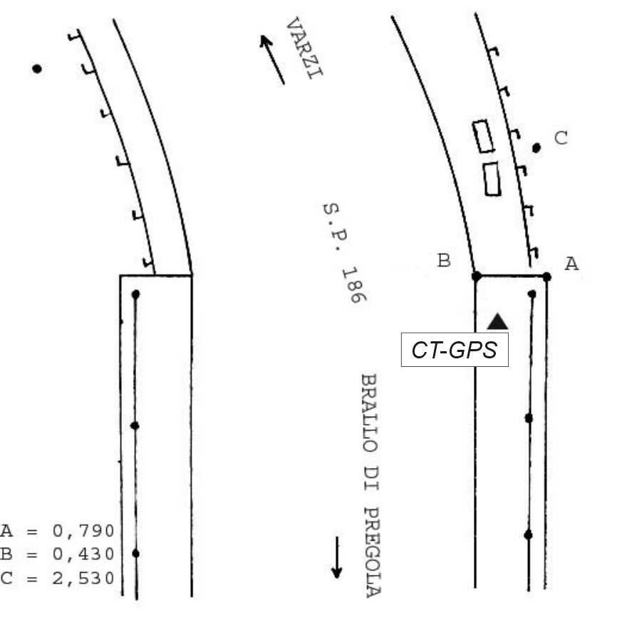 | materializzazione | Centrino Provincia Pavia infisso sullo spigolo nord-est del marciapiede in calcestruzzo del ponte della S.P. 186 sul torrente Aronchio, al Km. 3,100, in località Molino San Pietro. |