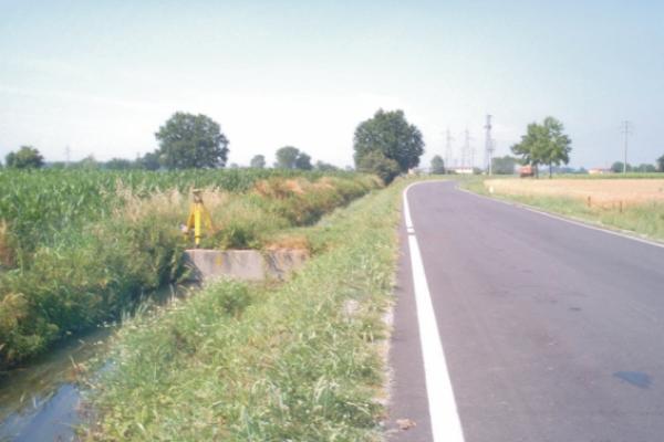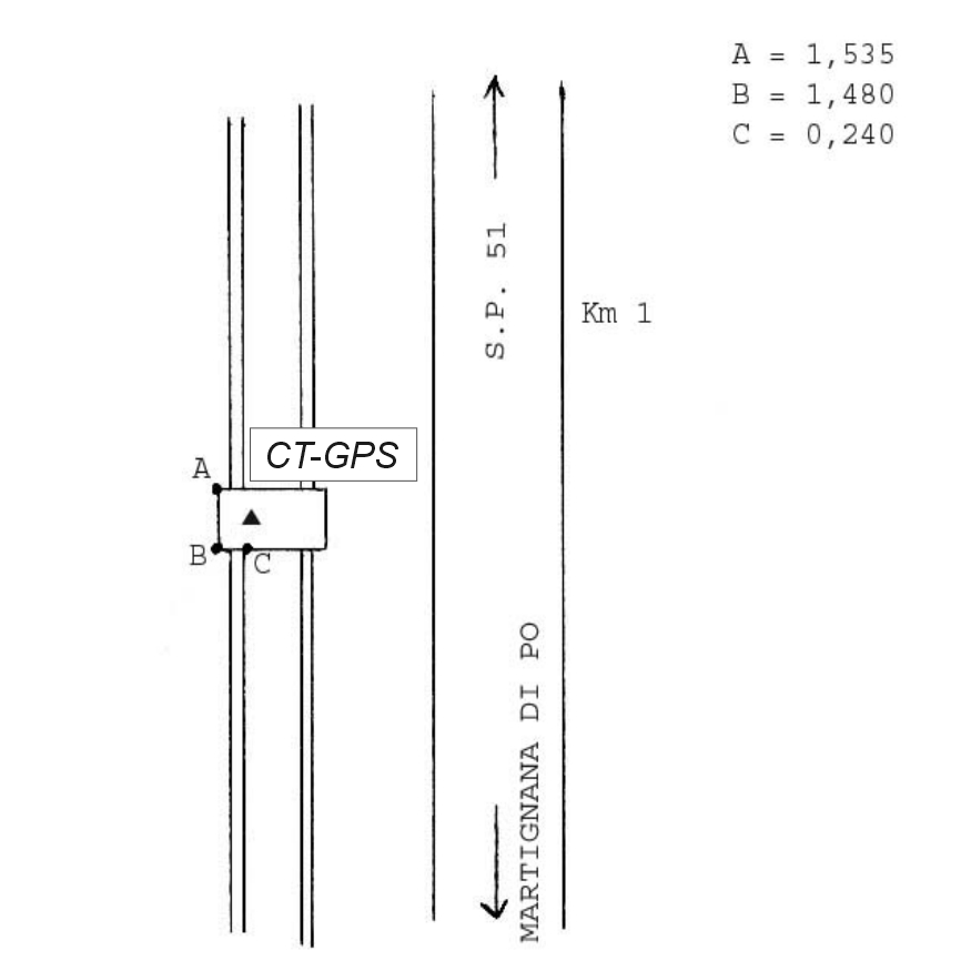 Centrino Regione Lombardia infisso sul cordolo del tombino in calcestruzzo all'altezza del Km. 0,950 della S.P. 51, appena a nord-ovest dell'abitato di Martignana di Po.
