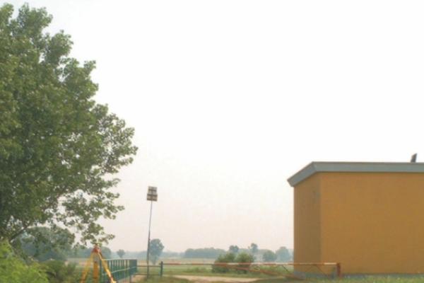 Centrino Regione Lombardia infisso sullo spigolo nord-est del cordolo in calcestruzzo della chiusa sul canale, alla sommità dell'argine del fiume Adda, in località Il Chiavicone.