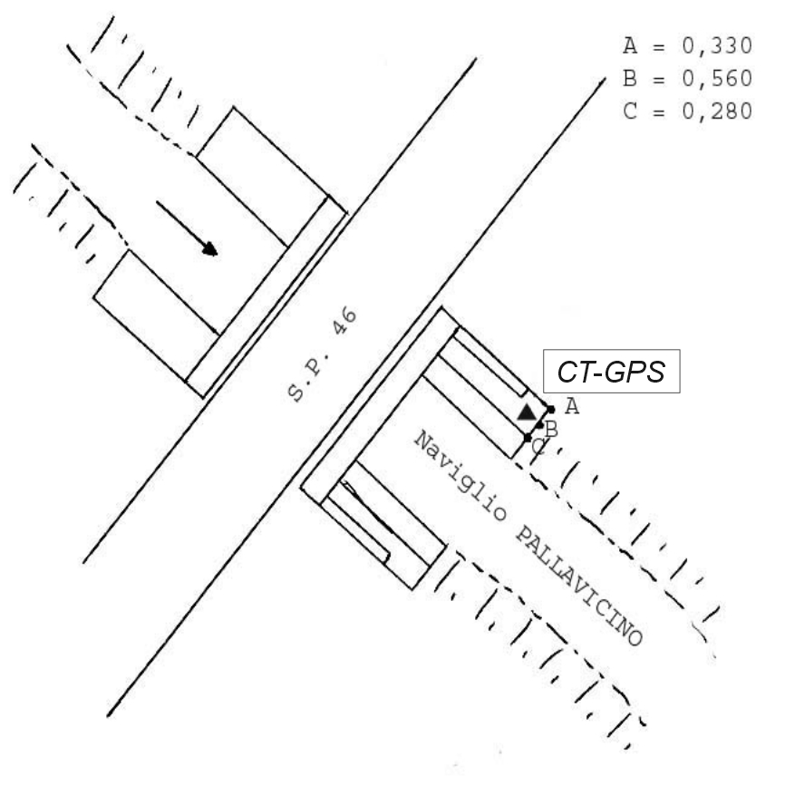 | materializzazione | Centrino Regione Lombardia infisso sullo spigolo sud del muro d'ala in calcestruzzo della spalla est del ponte della S.P. 46 sul Naviglio Pallavicino, al Km. 1,350, in località Azzanello. |