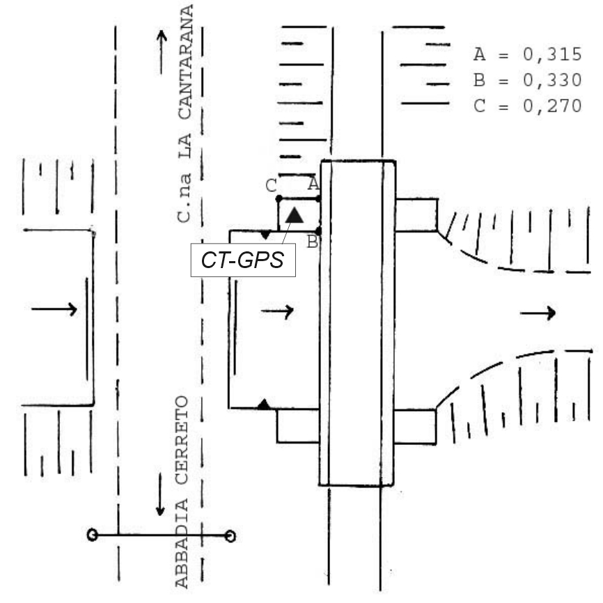 Centrino Regione Lombardia infisso sullo spigolo nord-ovest della spalla del manufatto di canalizzazione in calcestruzzo all'incrocio di due fossi, in località Cascina la Cantarana, ad Abbadia Cerreto.
