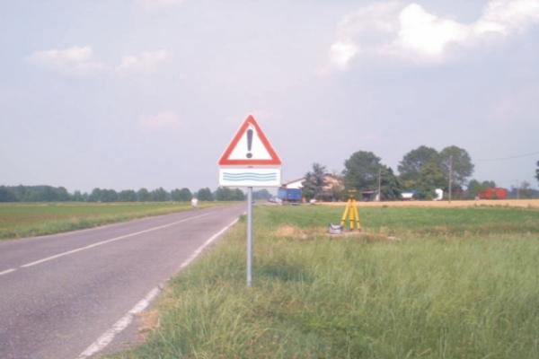 Centrino Regione Lombardia infisso sul cordolo in calcestruzzo del tombino della S.P. 109 ubicato di fronte a Cascina Linosa, in località omonima.
