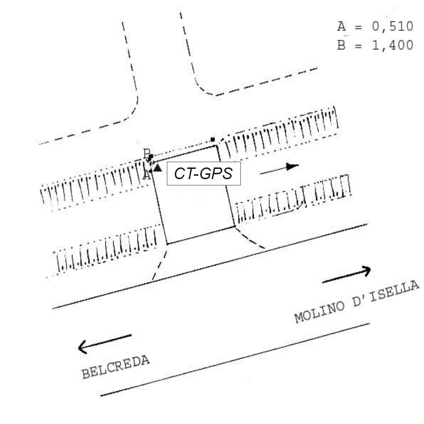 | materializzazione | Centrino della Provincia di Pavia, rete GPS vertice n.° 22, infisso sullo spigolo nord-ovest del tombino in calcestruzzo della strada che conduce a Cascina Cerada sul canale d'irrigazione, in località omonima. |
