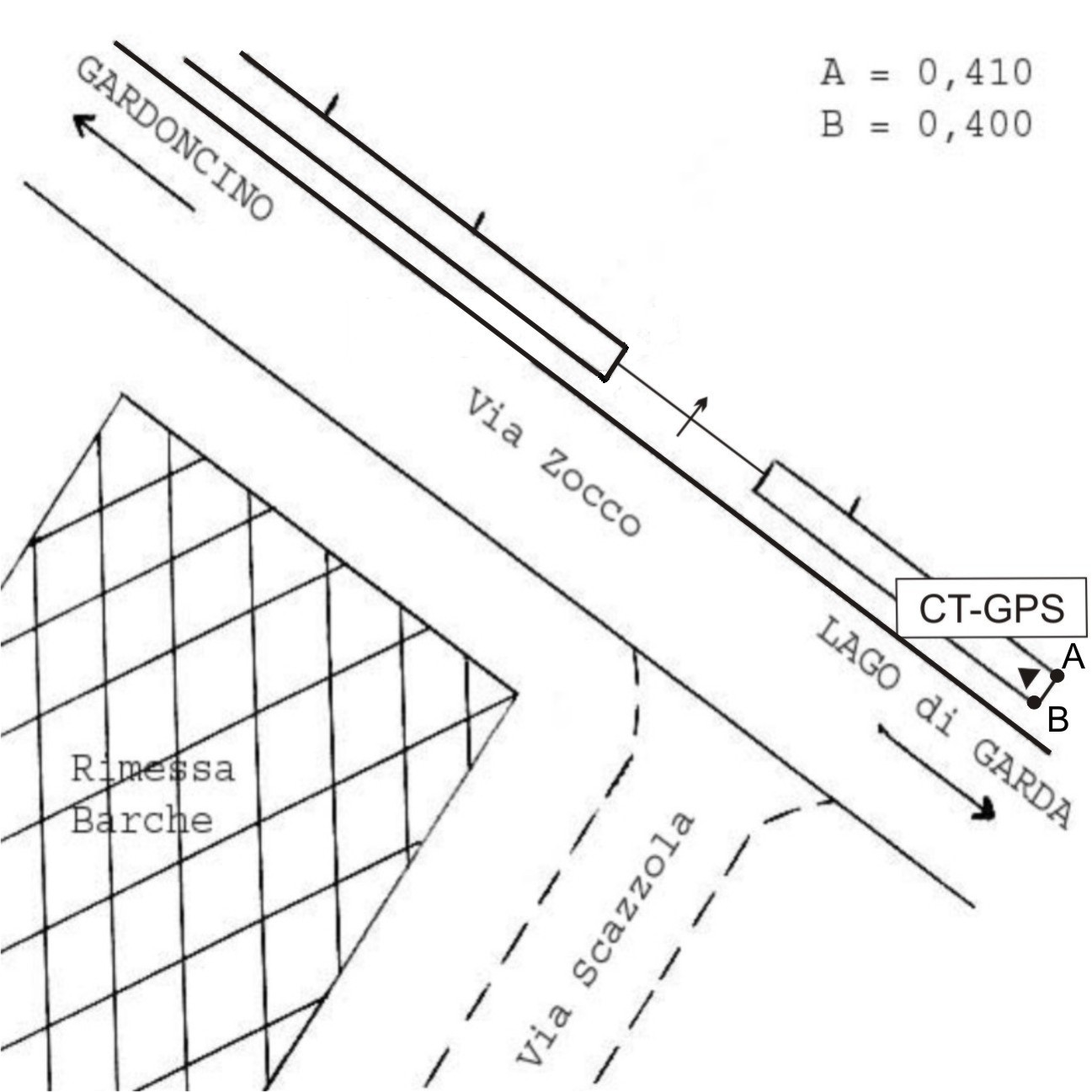 | materializzazione | Centrino della Direzione Generale del Catasto SS.TT.EE. infisso sulla sommità del muretto divisorio in calcestruzzo di via Zocco, all'incrocio con via Scazzola, di fronte al secondo cancello del rimessaggio nautico, in località Villaggio San Sivino. |