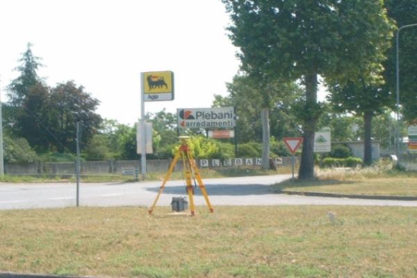 Centrino Regione Lombardia infisso sulla sommità del manufatto in calcestruzzo posto al centro dell'aiuola spartitraffico, in corrispondenza dell'incrocio tra il Km. 249,500 della S.S. 11 e via Industria e Commercio, in località Ponte San Marco.