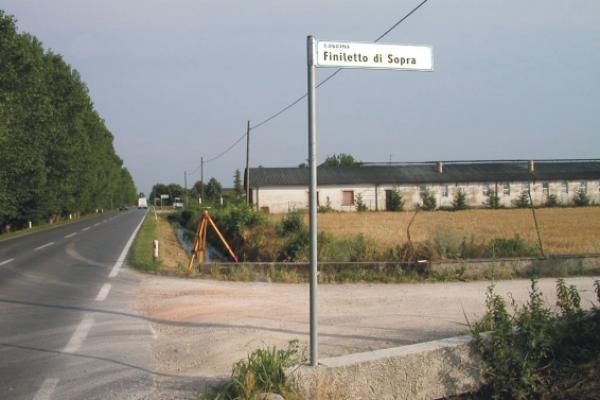 Centrino Regione Lombardia infisso sullo spigolo sud-est del tombino in calcestruzzo della strada di accesso alla Cascina Finiletto di Sopra sulla scolina a fianco della S.P. VIII, in corrispondenza del Km. 22,150, in località Finiletto di Sopra.
