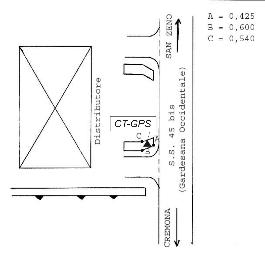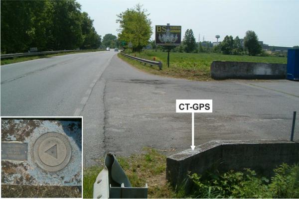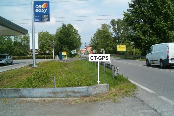 Centrino Regione Lombardia infisso sul muretto del ponticello in calcestruzzo dell' accesso sud all'area del distributore, in corrispondenza del Km. 42,200 della S.S. 45 bis (Gardesana Occidentale), a San Zeno Naviglio.