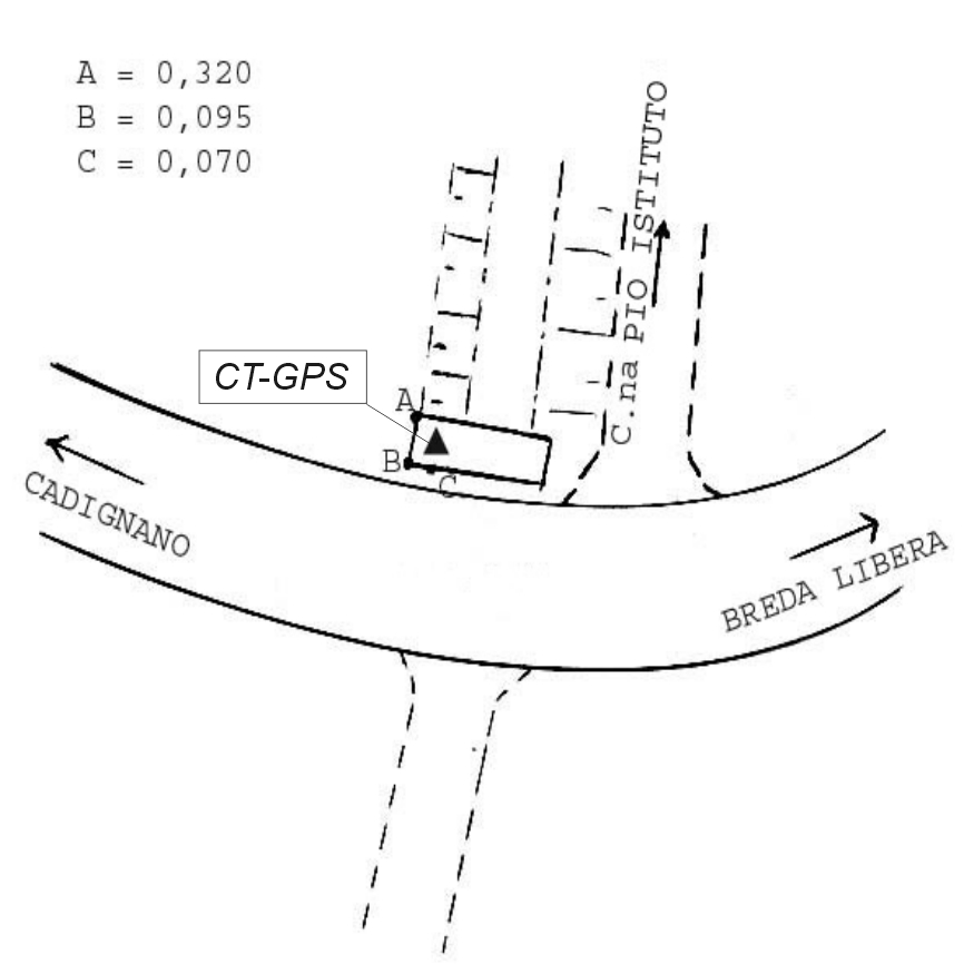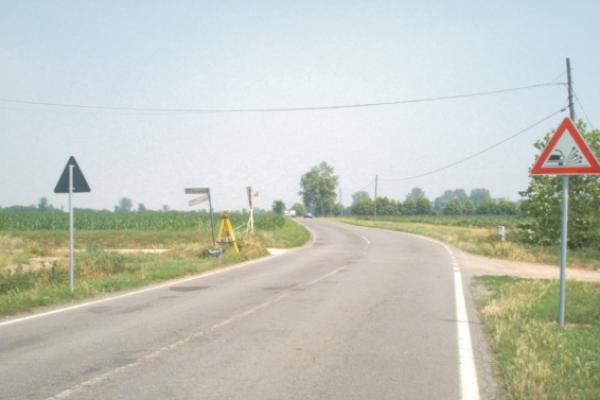Centrino Regione Lombardia infisso sullo spigolo nord-ovest del cordolo in calcestruzzo del parapetto in muratura del ponte della S.S. 668 sul fosso, all'altezza dell'incrocio con la strada poderale per la cascina Pio Istituto, in località Cadignano.
