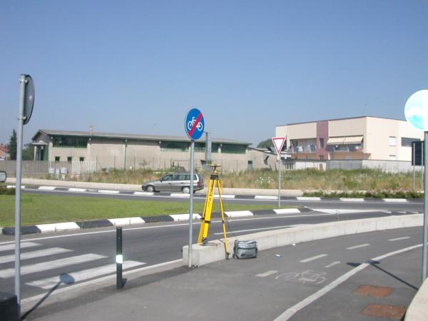 Centrino Regione Lombardia infisso sullo spigolo sud del muretto di divisione in calcestruzzo delimitante la carreggiata dalla pista ciclabile, nei pressi della rotonda di via Balilla, a Romano di Lombardia.