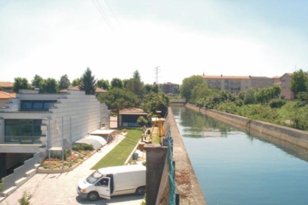 Centrino Regione Lombardia infisso sulla sommità della colonna in calcestruzzo ubicata sul lato est del muro di sostegno del canale, di fronte al civico 2 di via F. Nullo, a Filago.