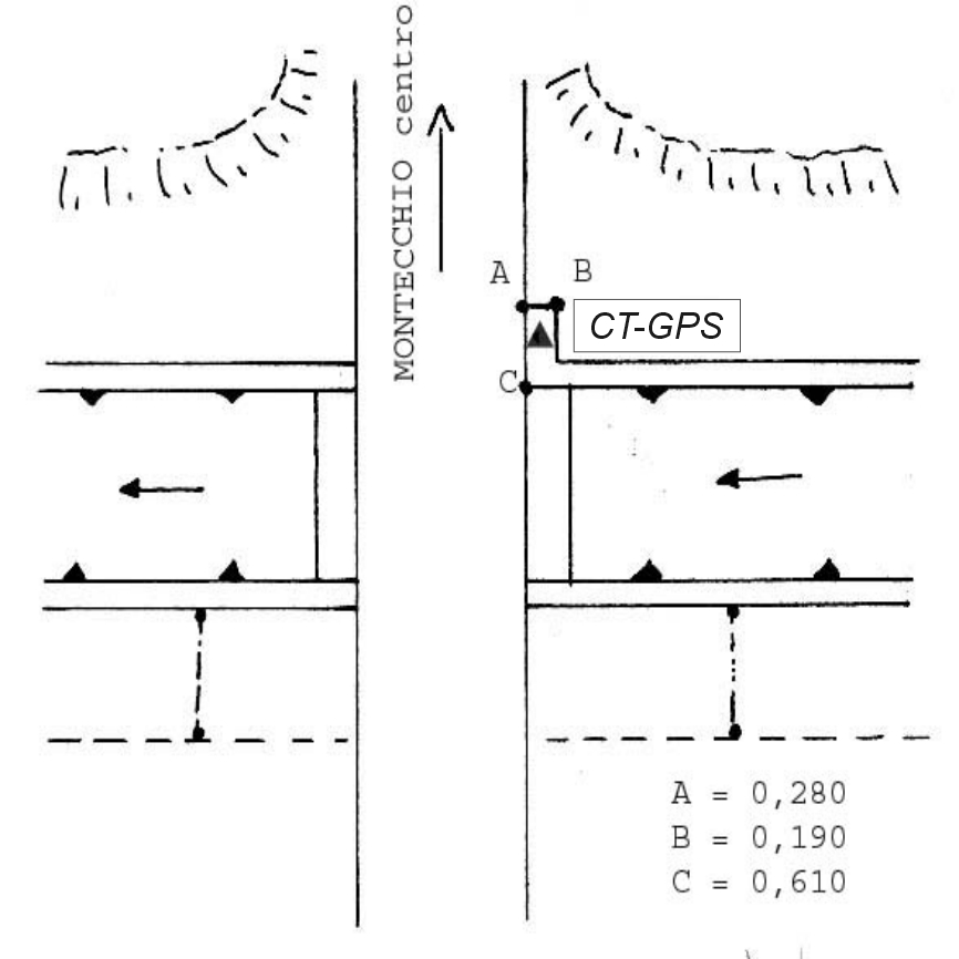 | materializzazione | Centrino del tipo di superficie della Direzione Generale del Catasto infisso sullo spigolo nord-est del cordolo del ponte sul canale di deflusso dell'impianto idroelettrico, in località Barbara. |