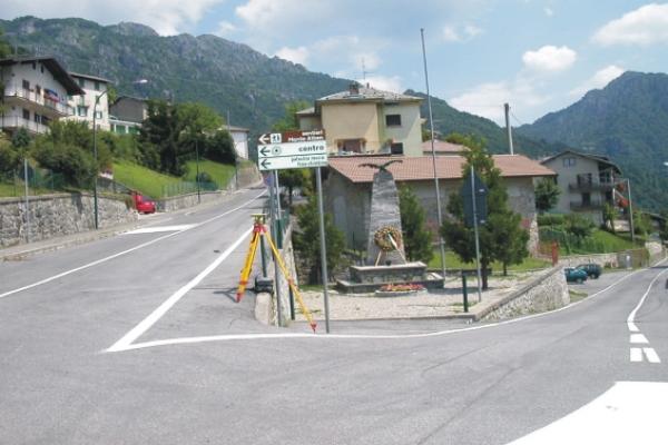 Centrino Regione Lombardia infisso sullo spigolo nord-ovest del muro di sostegno in calcestruzzo della strada che da Serina conduce a Cornalba, all'incrocio tra via Papa Giovanni XXIII e via don Paganelli, 25 metri dopo la chiesa di Cornalba, in località omonima.