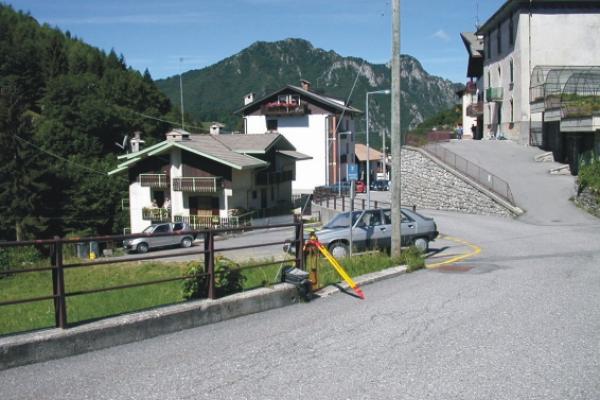 Centrino Regione Lombardia infisso sulla sommità del muro di sostegno in calcestruzzo di via Vanini, ad Oltre il Colle.