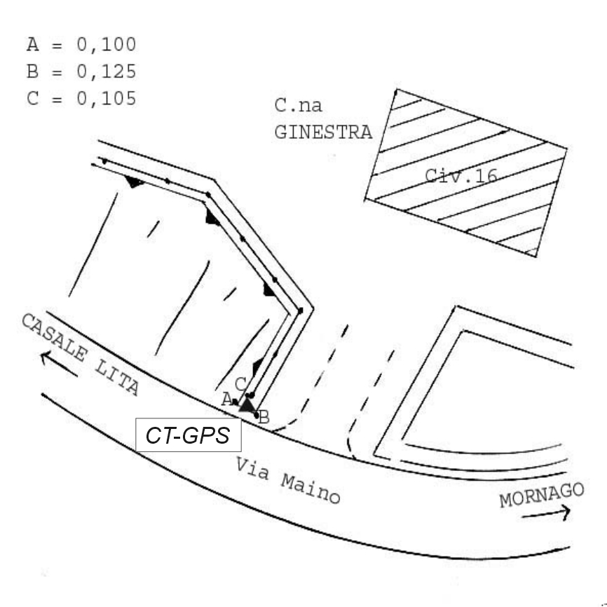 | materializzazione | Centrino Regione Lombardia infisso sulla sommità del muro di recinzione in calcestruzzo ubicato in via Maino, a Mornago, di fronte al civ. 16 (Cascina Ginestra). |