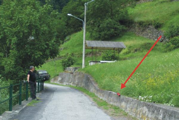 Centrino Regione Lombardia infisso sulla sommità del muro di sostegno in calcestruzzo della strada che conduce a Cagnoletti, nei pressi del vecchio lavatoio, in località Cagnoletti.