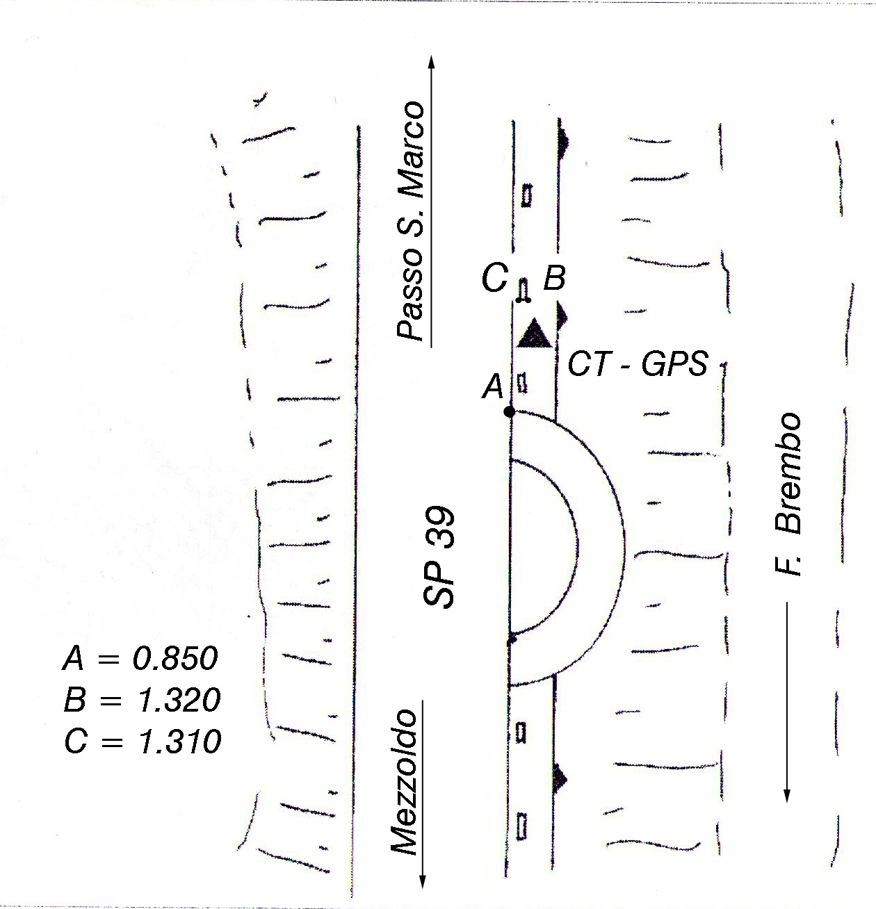 Centrino Regione Lombardia infisso sullo spigolo sud del cordolo in calcestruzzo del muro di sostegno in pietra che funge da argine del fiume Brembo, al Km. 53,200 della S.P. 9, vicino ad un piccolo spiazzo a forma semicircolare.