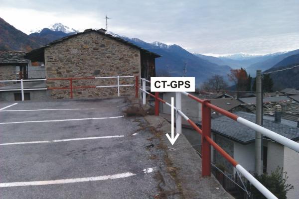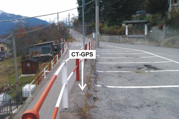 Centrino Regione Lombardia infisso sul cordolo in calcestruzzo del muro di sostegno del parcheggio ubicato nella zona sud-ovest di Rocaglia di Sotto, lungo la strada principale.