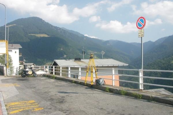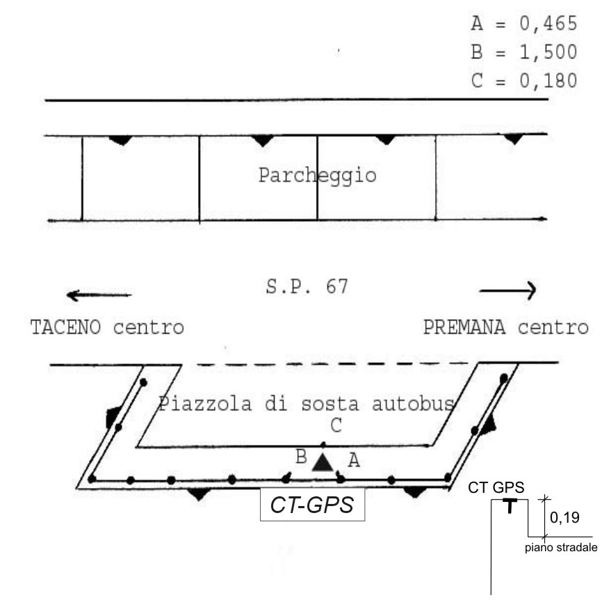 Centrino Regione Lombardia infisso sulla sommità, pressochè in mezzeria, del muro di sostegno in calcestruzzo della piazzola di sosta per autobus, ubicata lungo la S.P. 67, in località Premana.