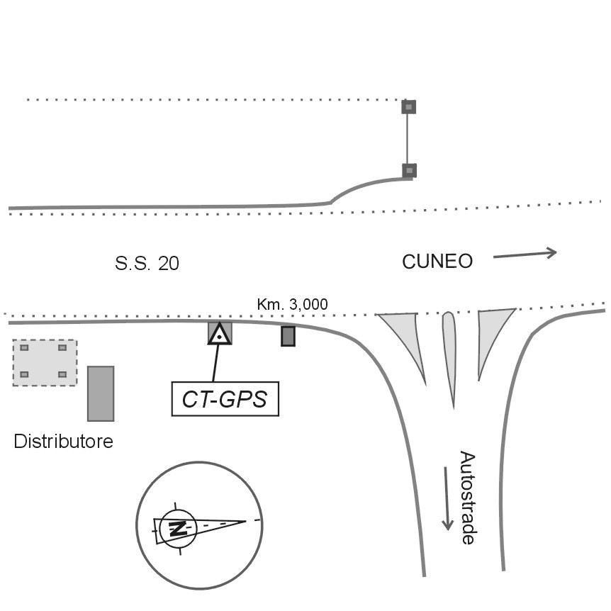 | materializzazione | Centrino in acciaio inox del tipo GPS da livellazione infisso nel basamento di un lampione (ora rimosso) lungo il lato destro della S.S. 20, direzione Cuneo, tra un distributore di benzina e il raccordo per la tangenziale. |