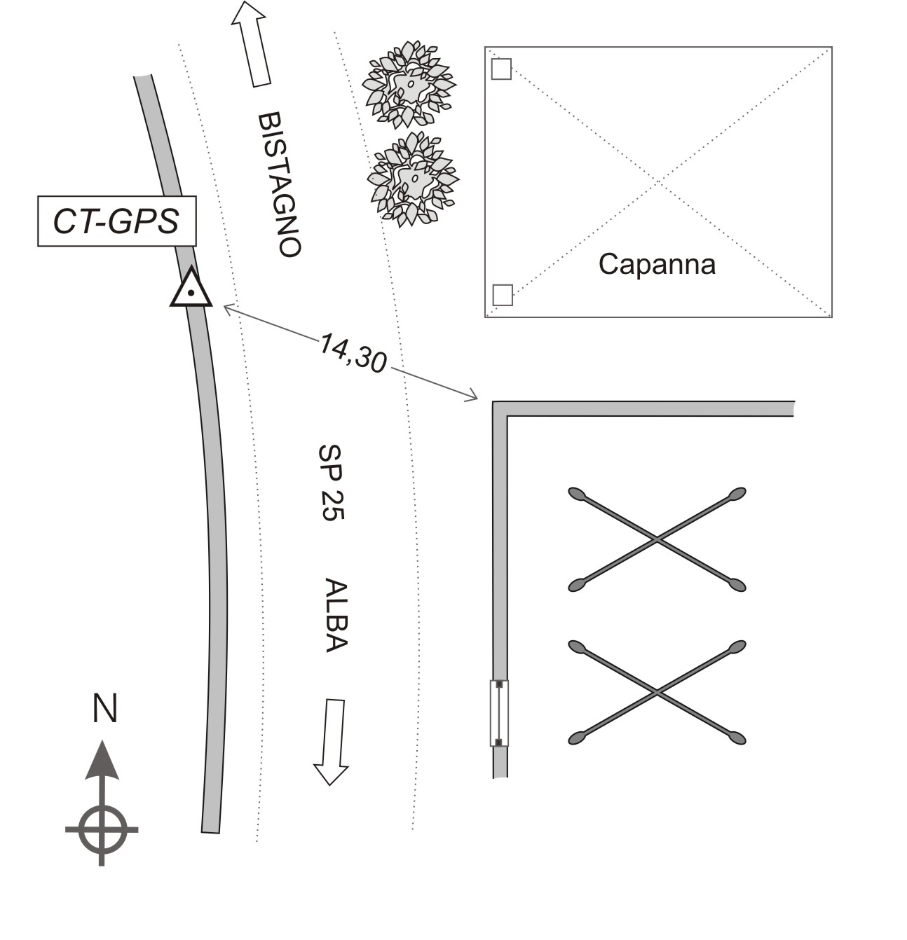 Centrino in acciaio inox del tipo GPS da livellazione infisso sulla sommità del muro di sostegno in calcestruzzo al Km 24,640 della S.P. 25, sito al lato della strada sul lato opposto del cimitero.