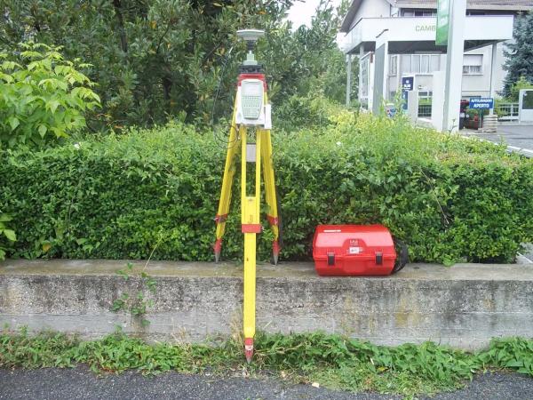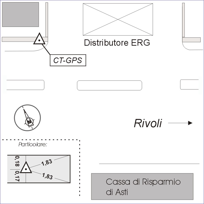 Centrino in acciaio inox del tipo GPS da livellazione infisso sulla sommità del muretto in cemento armato di recinzione della proprietà adiacente al distributore di benzina ERG, a sinistra di quest'ultimo, fronte strada, in direzione di Susa.