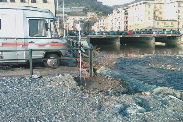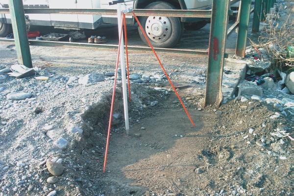 Centrino in acciaio inox del tipo GPS da livellazione infisso nella massicciata del parcheggio retrostante il municipio, presso lo spigolo sud-est, oltre il parapetto.