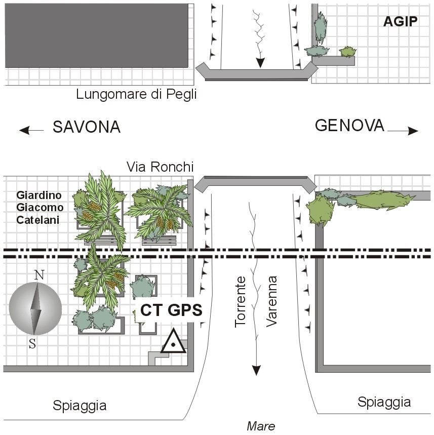 Centrino in acciaio inox del tipo GPS da livellazione infisso sulla seduta dell'aiuola, più prossima alla spiaggia, dei giardini "Giacomo Catelani", cosi' come schematizzato nello schizzo monografico.