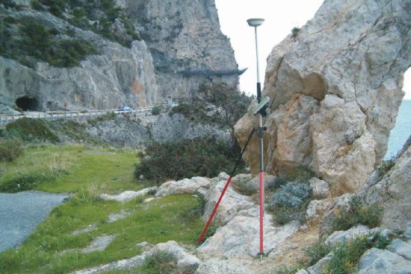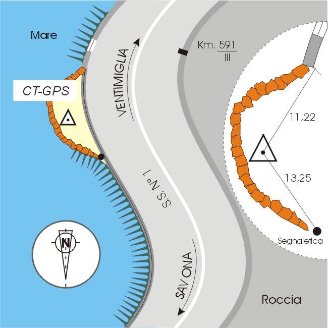 | Materializzazione | Centrino in acciaio inox del tipo GPS da livellazione infisso su roccia affiorante posta oltre il guard-rail della S.S. 1 Km 591,300 lato mare, nei pressi dello sperone roccioso più alto. |