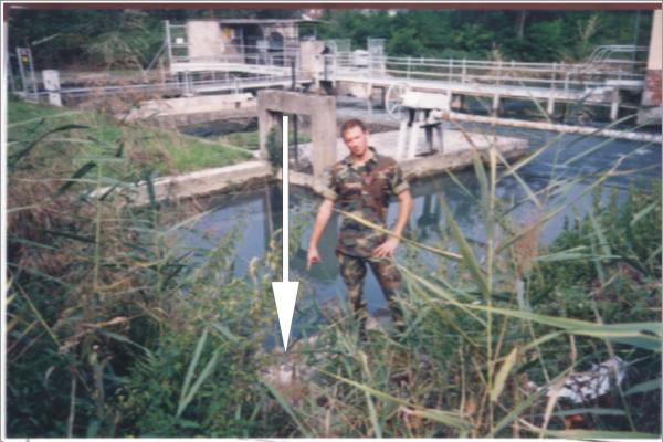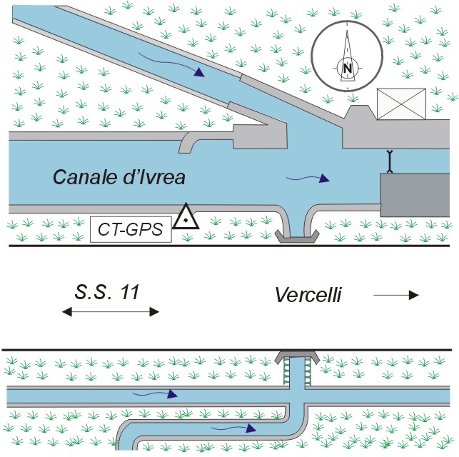 | materializzazione | Centrino in acciaio inox del tipo GPS da livellazione infisso sulla sommità del muro della chiusa, prospiciente la strada, sul naviglio di Ivrea, in prossimità dI un casotto. |