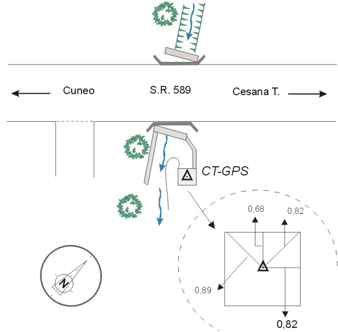 | materializzazione | Centrino in acciaio inox del tipo GPS da livellazione infisso alla sommità del chiavicotto in cemento armato a base quadrata posto a sud del ponticello della strada regionale n° 589 al Km 84,470. |