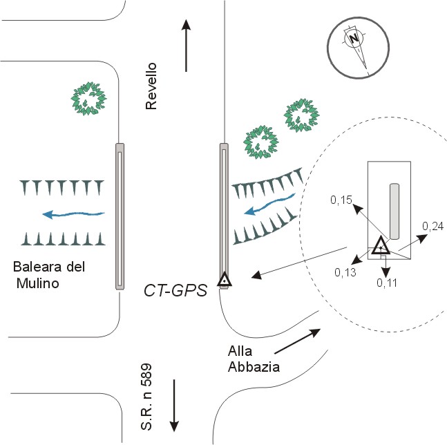 | materializzazione | Centrino in acciaio inox del tipo GPS da livellazione infisso alla sommità della spalla sinistra a monte del ponticello sul Baleara del Mulino, posto sulla strada che conduce alla S.R n° 589 a Revello. |
