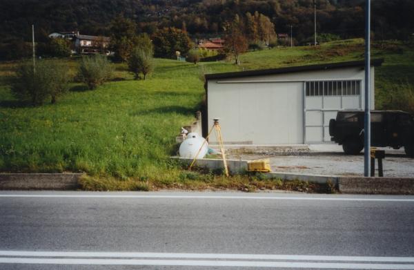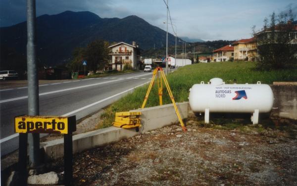 Centrino in acciaio inox del tipo GPS da livellazione infisso alla sommità del muretto, presso il bombolone del gas del distributore.