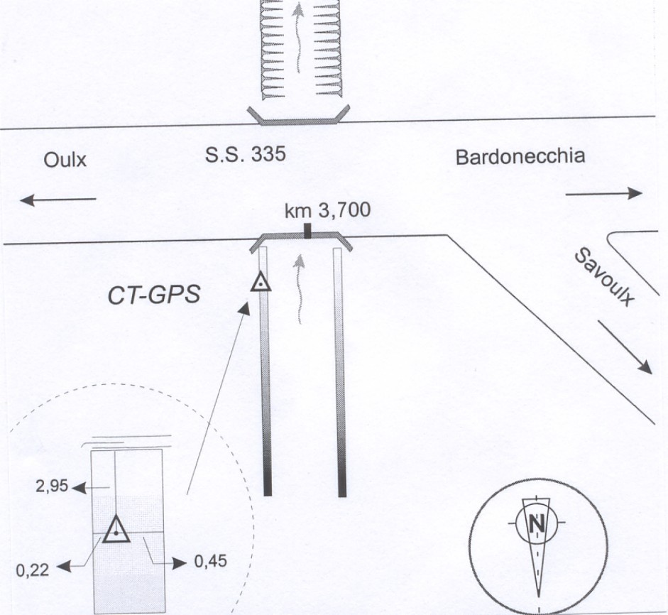 | materializzazione | Centrino in acciaio inox del tipo GPS da livellazione infisso sulla sommità del muro di contenimento in cemento armato, a destra, lato a monte a circa m. 2,95 dal ponticello nella periferia est del centro abitato di Savoulx. |